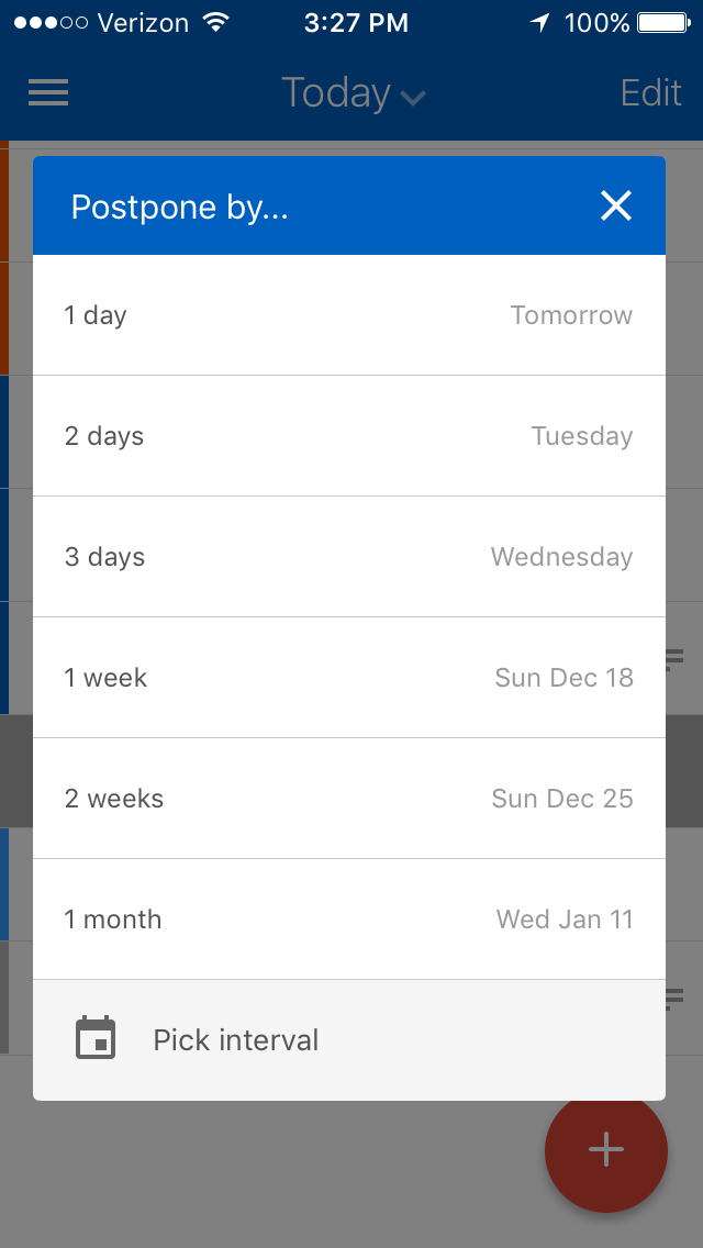 And if you don’t want one of the predefined choices, “Pick interval” allows you to pick a date in a number of days, weeks, months, or even years, with a couple taps (instead of having to scroll through one of the date picker wheels that most apps use).